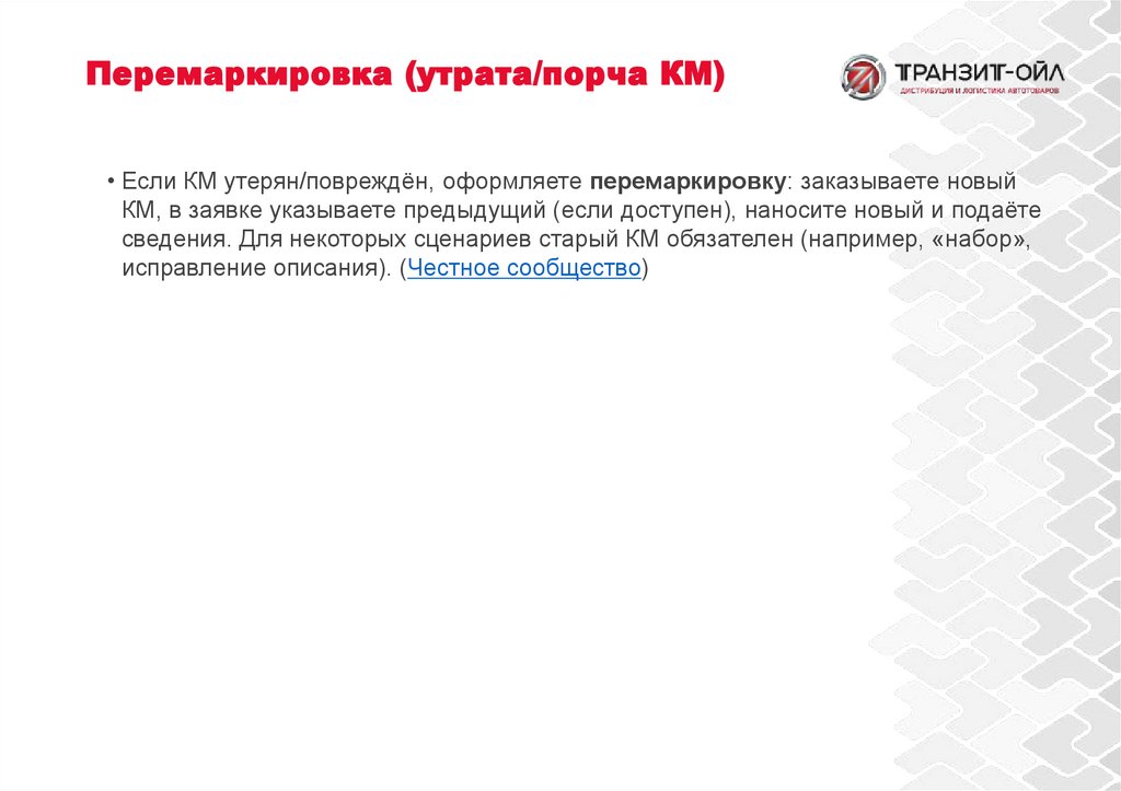 Перемаркировка (утрата/порча КМ)• Если КМ утерян/повреждён, оформляете перемаркировку: заказываете новый