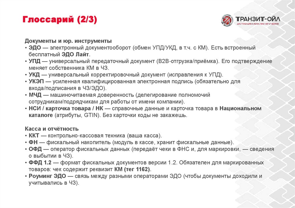 • ОФД — оператор фискальных данных (передаёт чеки в ФНС и, для маркировки, — сведения