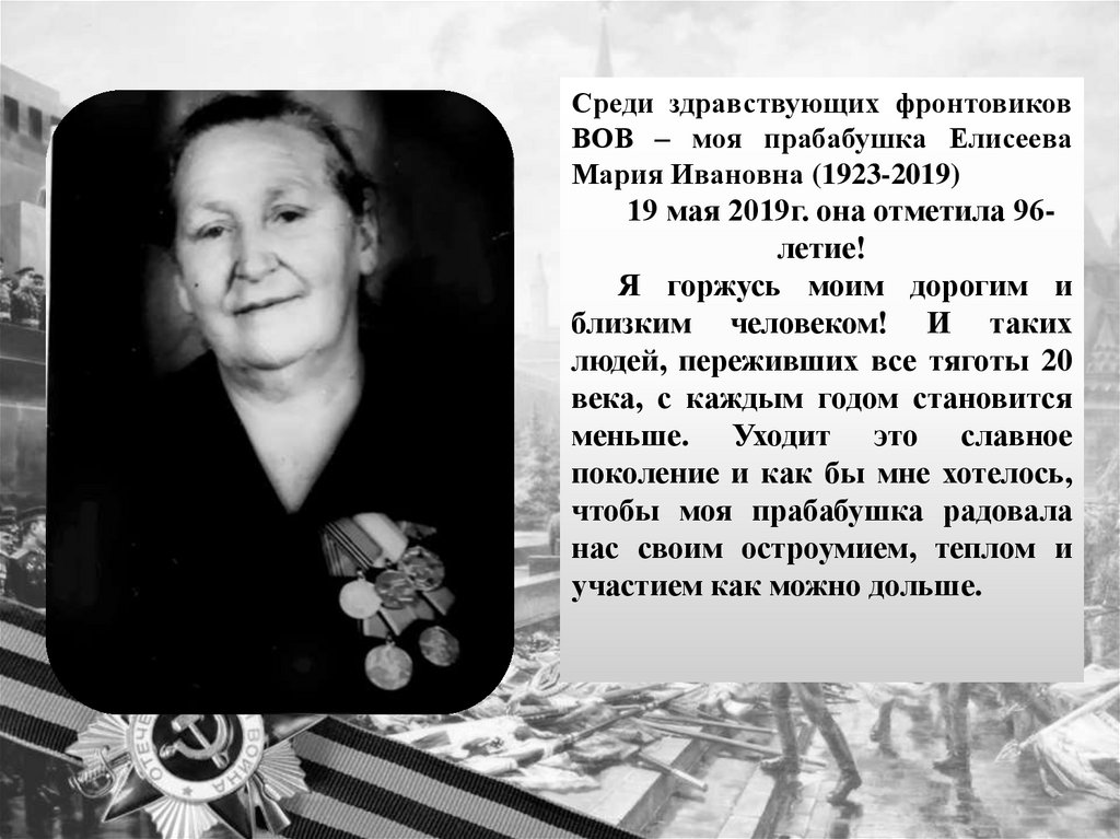Среди здравствующих фронтовиковВОВ – моя прабабушка Елисеева