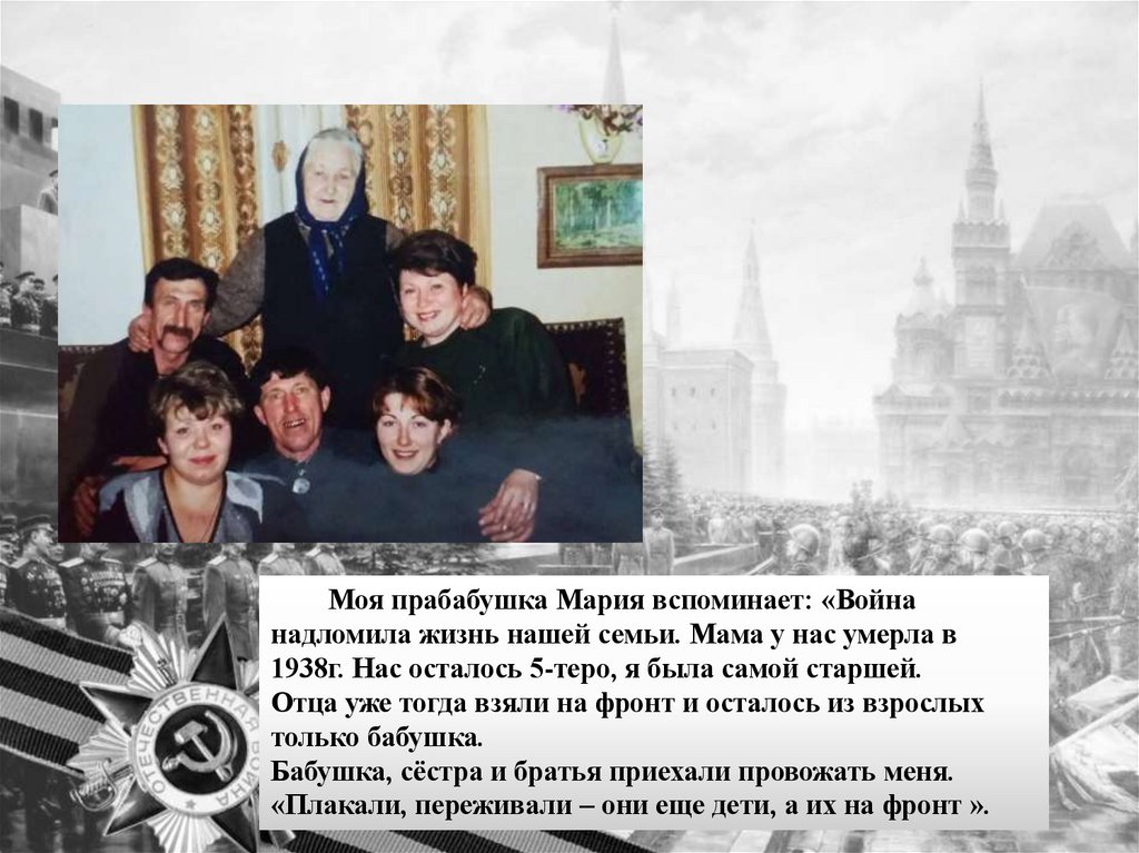 Моя прабабушка Мария вспоминает: «Войнанадломила жизнь нашей семьи. Мама у нас умерла в