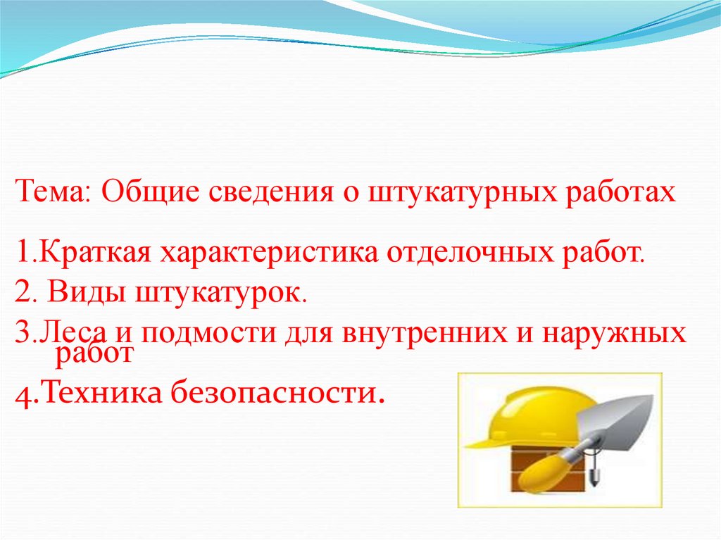 Тема: Общие сведения о штукатурных работах1.Краткая характеристика отделочных работ.