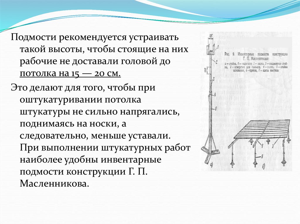 Подмости рекомендуется устраиватьтакой высоты, чтобы стоящие на них