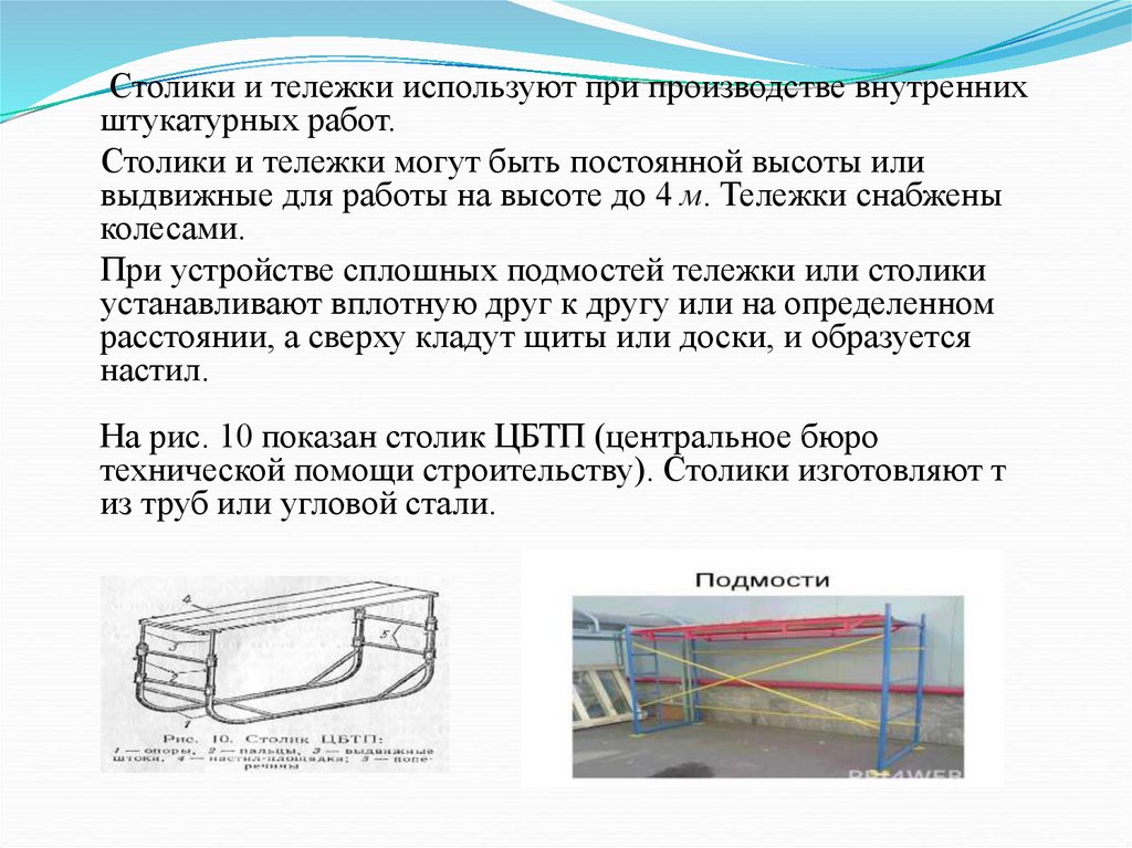 Столики и тележки используют при производстве внутреннихштукатурных работ.