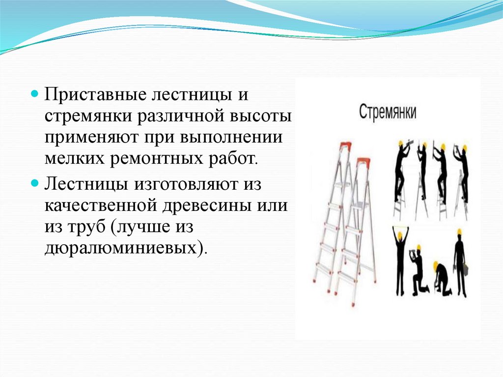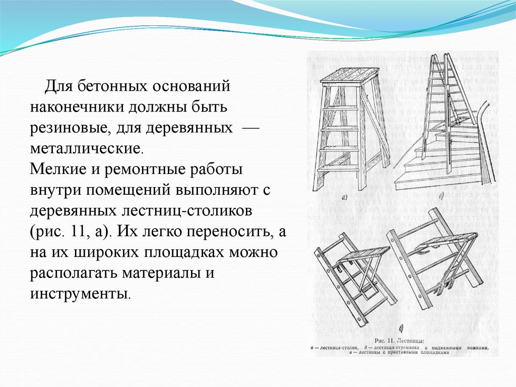 Лестницы, стремянки, площадки и переходы надосодержать в чистоте, удаляя с них мусор, раствор и остатки