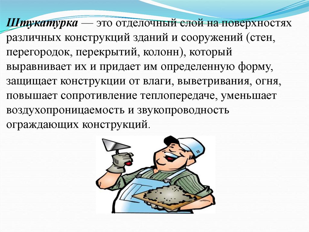Штукатурка — это отделочный слой на поверхностяхразличных конструкций зданий и сооружений (стен,