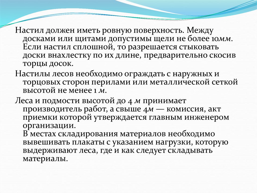 Настил должен иметь ровную поверхность. Междудосками или щитами допустимы щели не более 10мм.