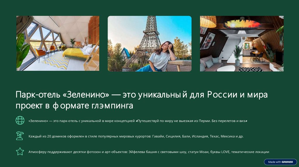Парк-отель «Зеленино» — это уникальны й для России и мирапроект в ф ормате глэмпинга