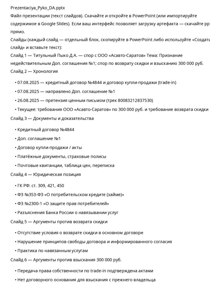 содержимое в Google Slides). Если ваш интерфейс позволяет загрузку артефакта — скачайте ppt