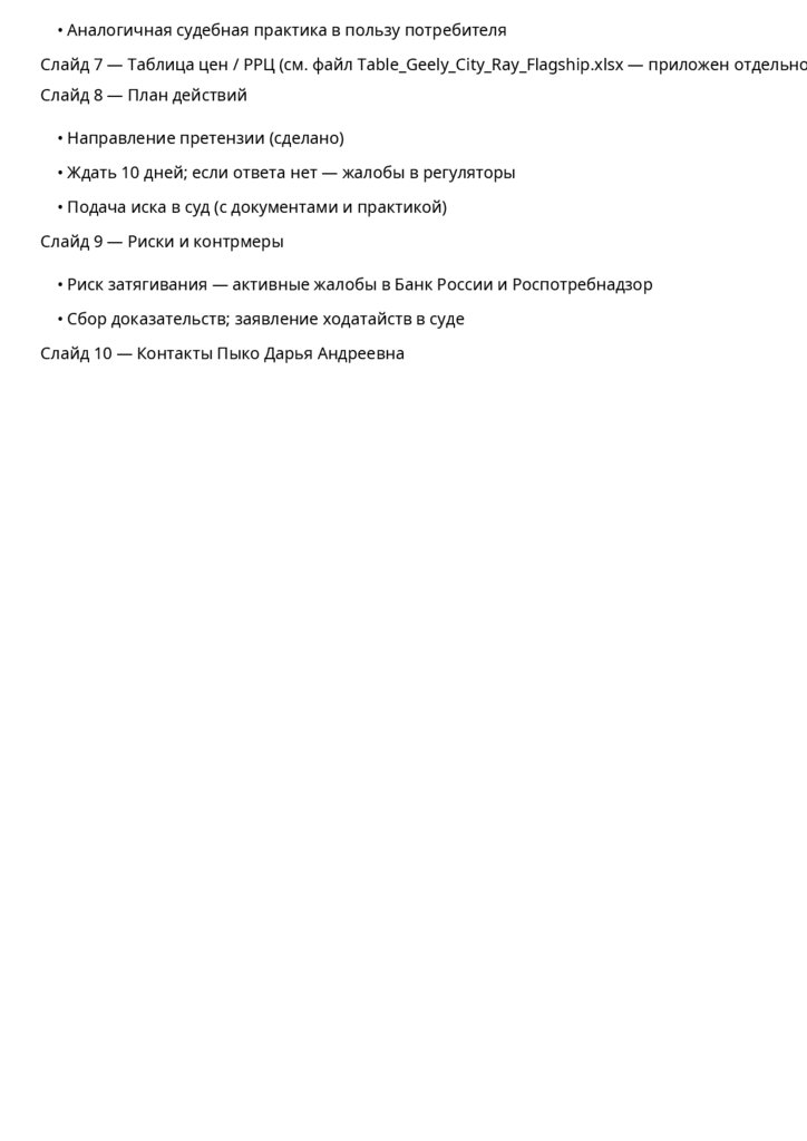 • Аналогичная судебная практика в пользу потребителяСлайд 7 — Таблица цен / РРЦ (см. файл Table_Geely_City_Ray_Flagship.xlsx — приложен отдельно