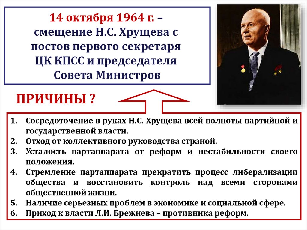 14 октября 1964 г. –смещение Н.С. Хрущева с
