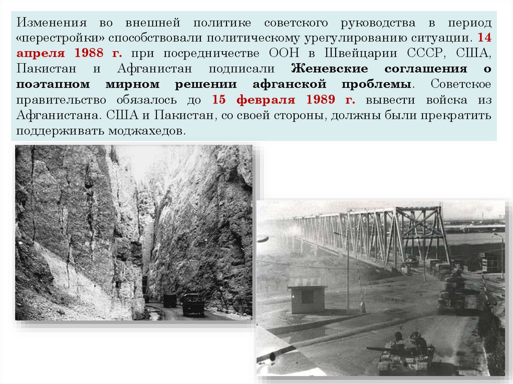 Изменения во внешней политике советского руководства в период«перестройки» способствовали политическому урегулированию ситуации. 14