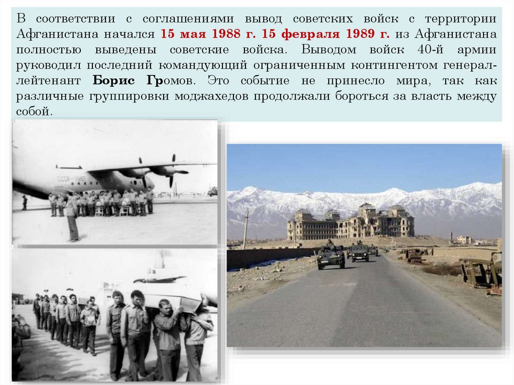 В соответствии с соглашениями вывод советских войск с территорииАфганистана начался 15 мая 1988 г. 15 февраля 1989 г. из Афганистана