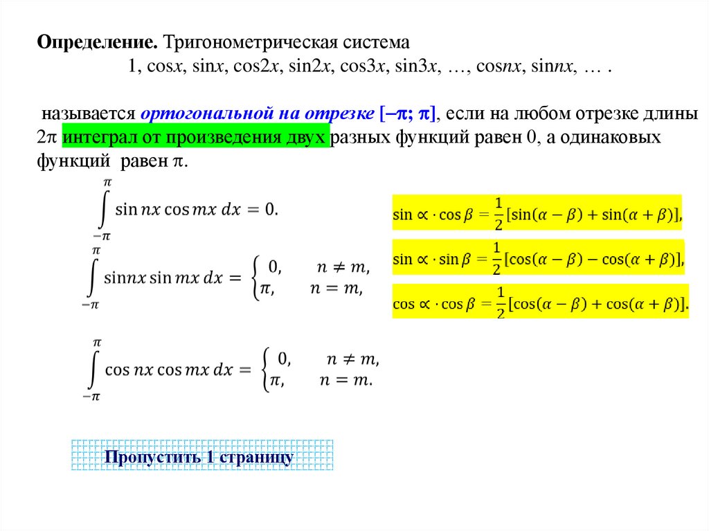 Определение. Тригонометрическая система1, cosx, sinx, cos2x, sin2x, cos3x, sin3x, …, cosnx, sinnx, … .