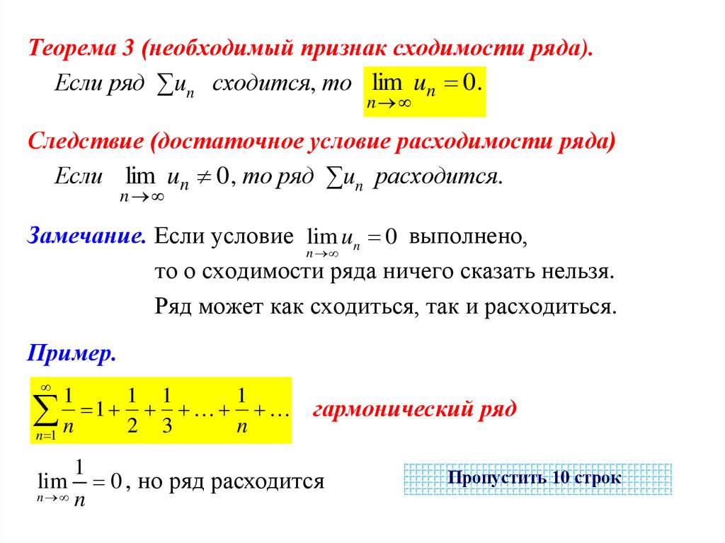 Теорема 3 (необходимый признак сходимости ряда).Если ряд ∑un сходится, то lim un 0 .