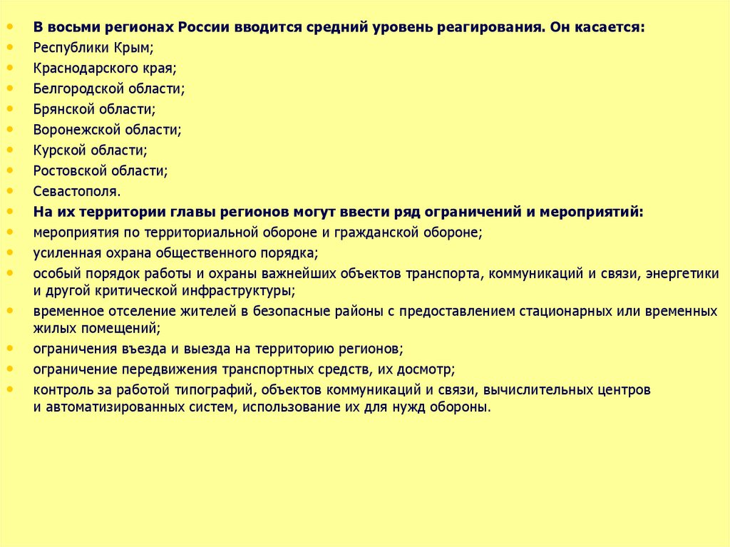 В восьми регионах России вводится средний уровень реагирования. Он касается: