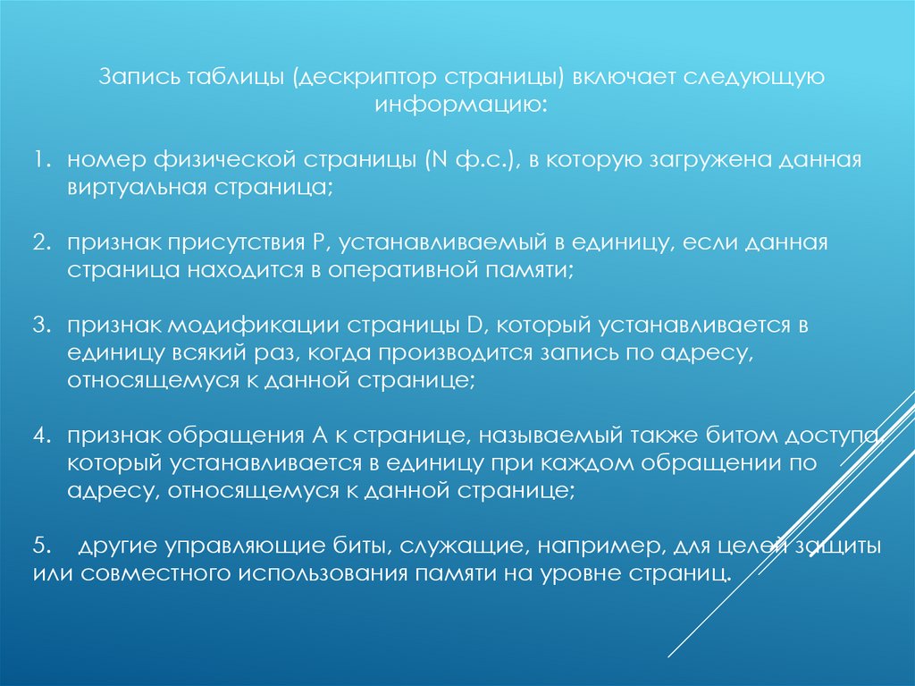 Запись таблицы (дескриптор страницы) включает следующуюинформацию: