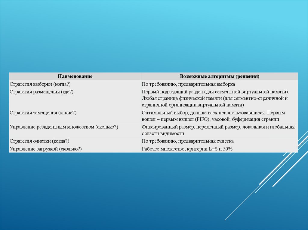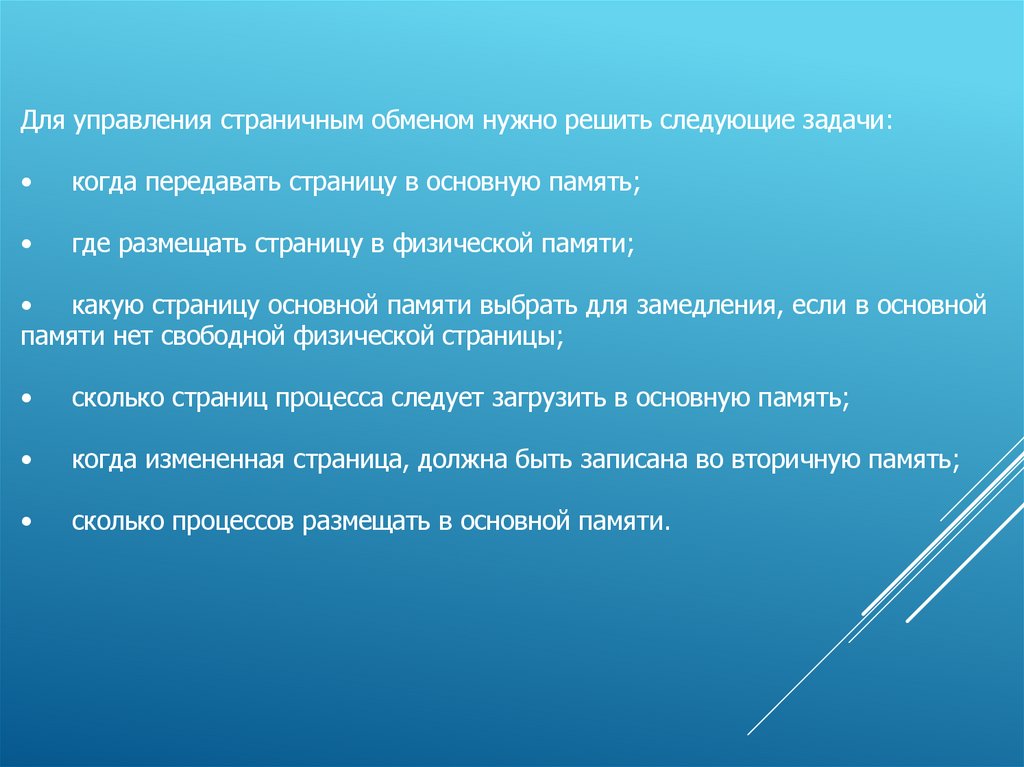 Для управления страничным обменом нужно решить следующие задачи:когда передавать страницу в основную память;