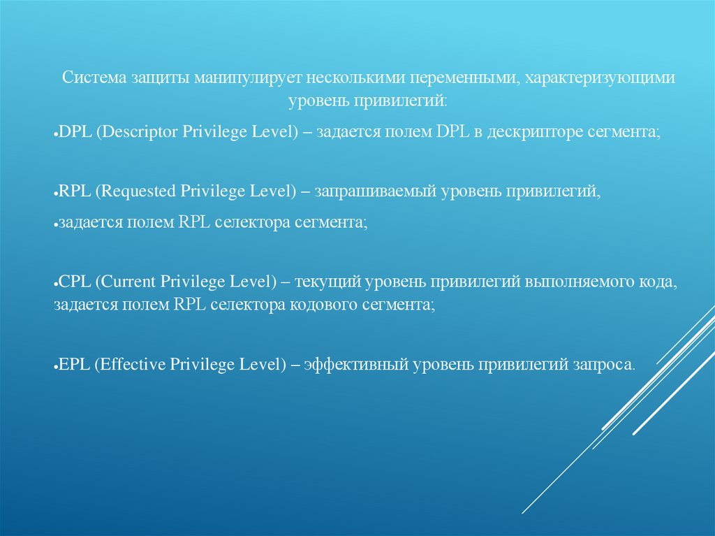 DPL (Descriptor Privilege Level) – задается полем DPL в дескрипторе сегмента;
