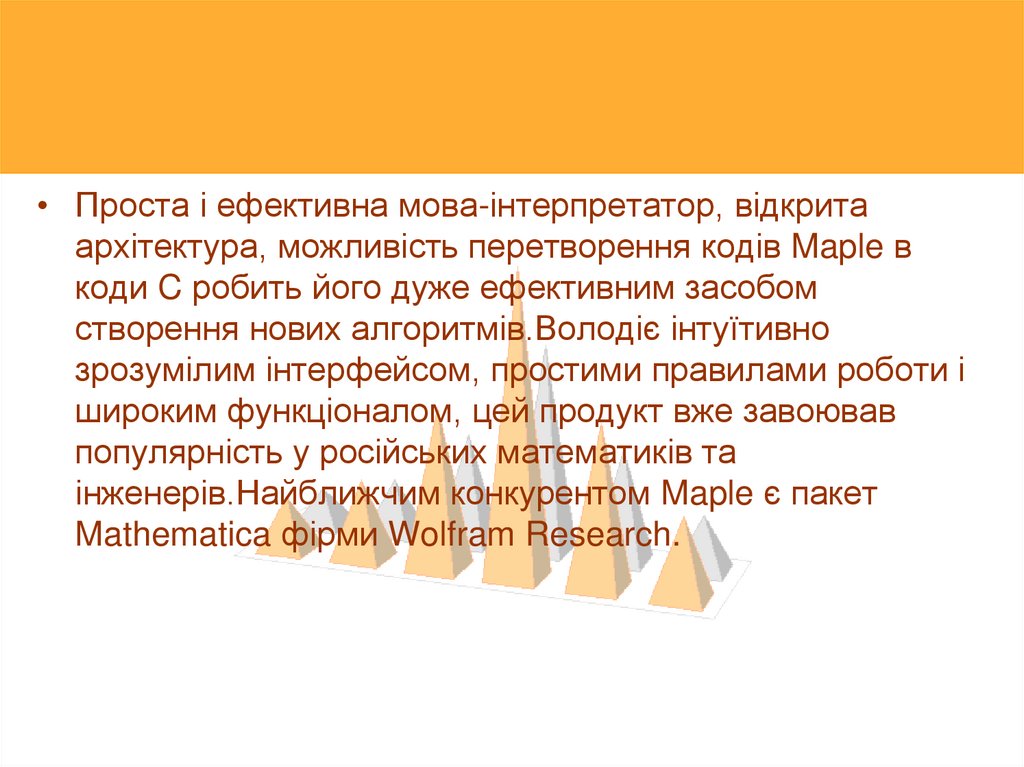 • Проста і ефективна мова-інтерпретатор, відкритаархітектура, можливість перетворення кодів Maple в