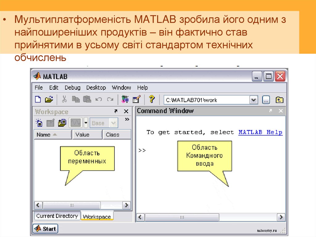• Пакет Matlab створювався для матричних обчислень зісвоєрідною мовою програмування високого рівня.