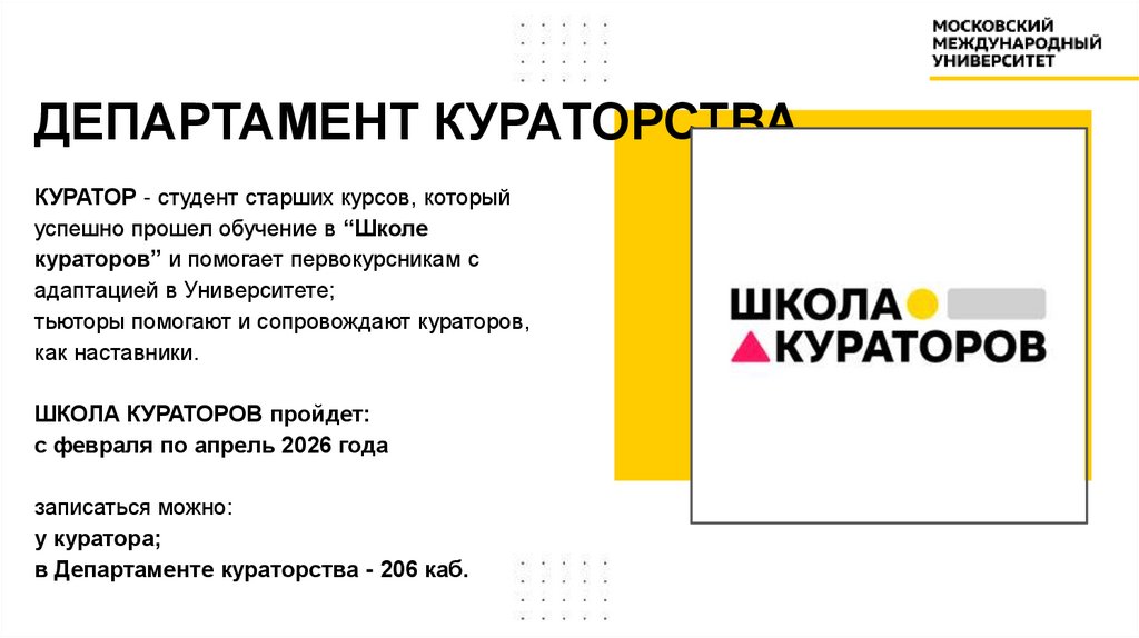 ДЕПАРТАМЕНТ КУРАТОРСТВАКУРАТОР - студент старших курсов, который