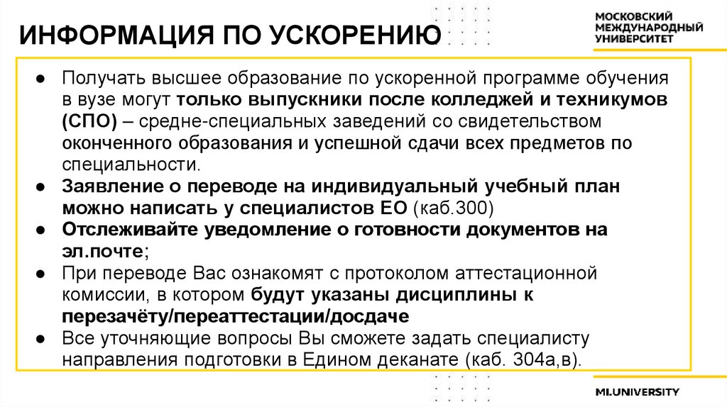 ИНФОРМАЦИЯ ПО УСКОРЕНИЮ● Получать высшее образование по ускоренной программе обучения