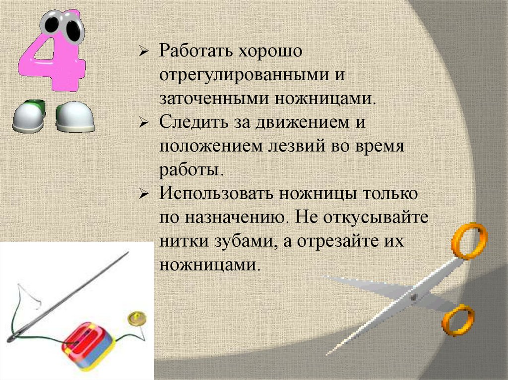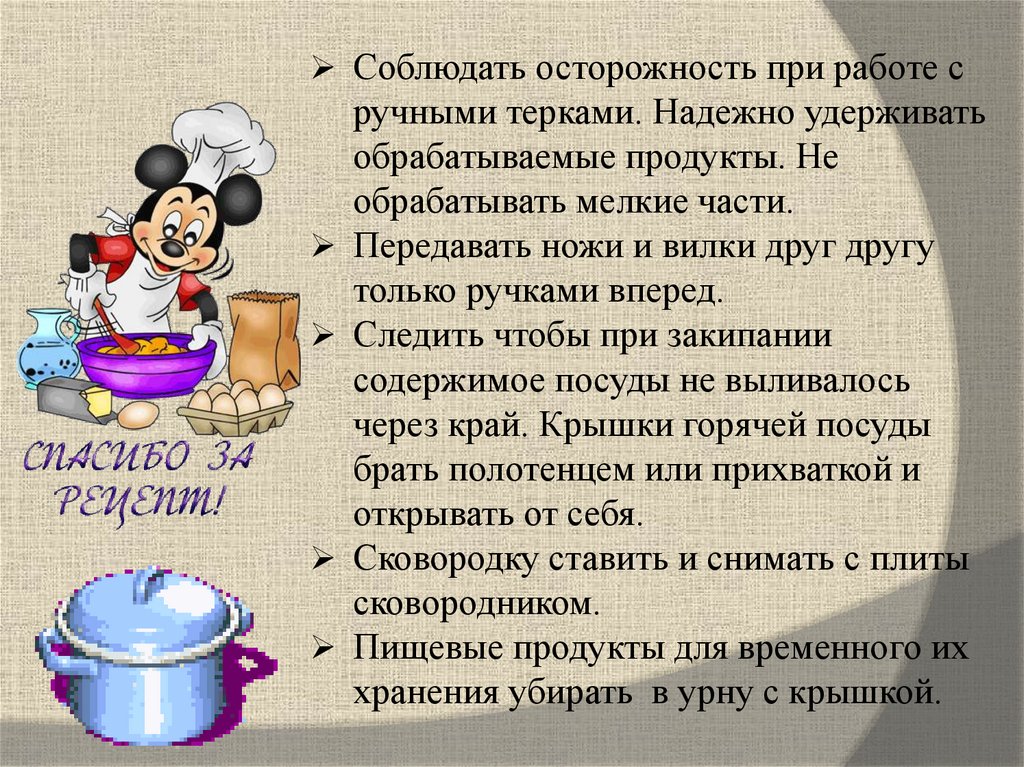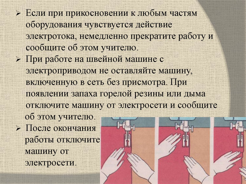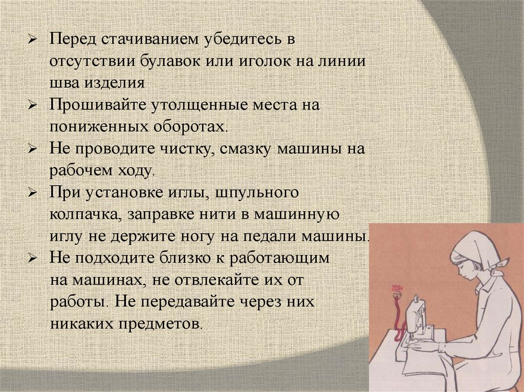 Выполнять правила техники безопасности прикулинарных работах, при работе на швейных