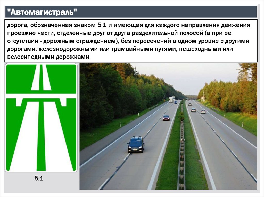 "Автомагистраль"дорога, обозначенная знаком 5.1 и имеющая для каждого направления движения
