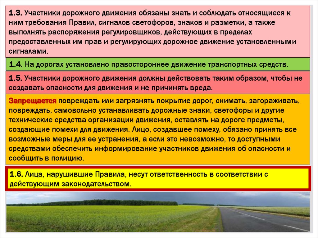 1.3. Участники дорожного движения обязаны знать и соблюдать относящиеся кним требования Правил, сигналов светофоров, знаков и разметки, а также