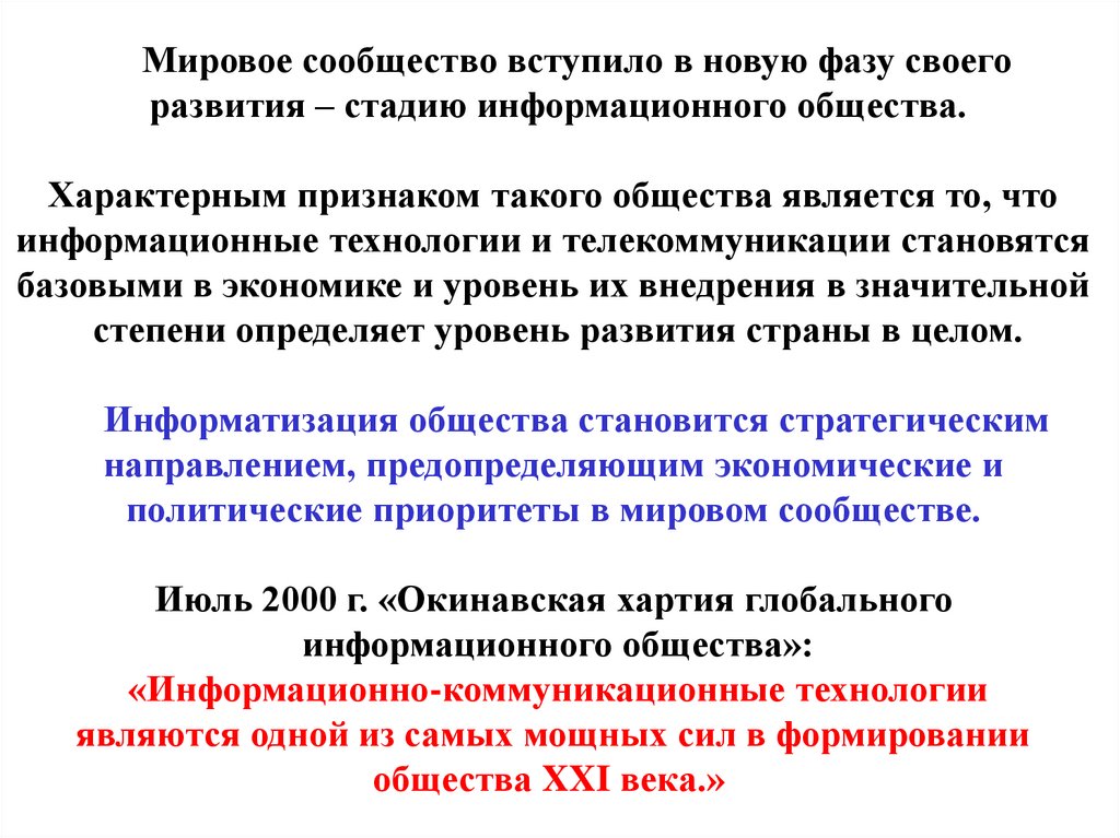 Мировое сообщество вступило в новую фазу своегоразвития – стадию информационного общества.