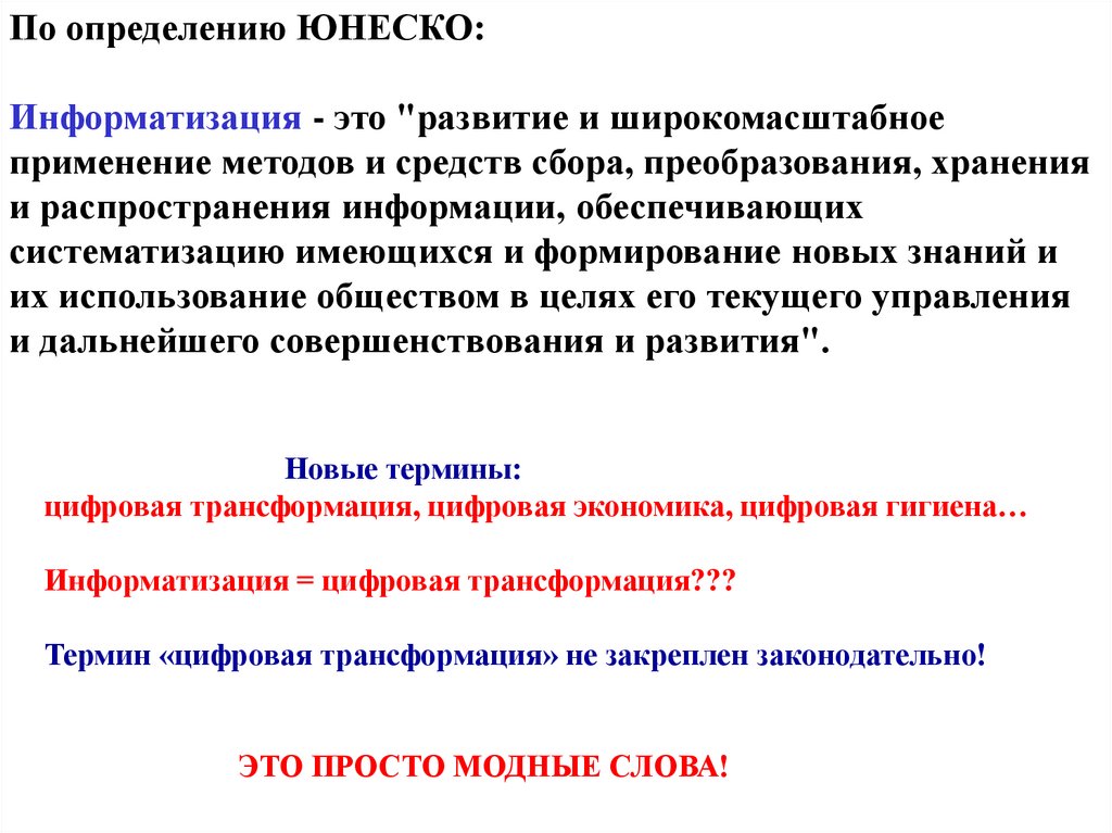 По определению ЮНЕСКО:Информатизация - это "развитие и широкомасштабное