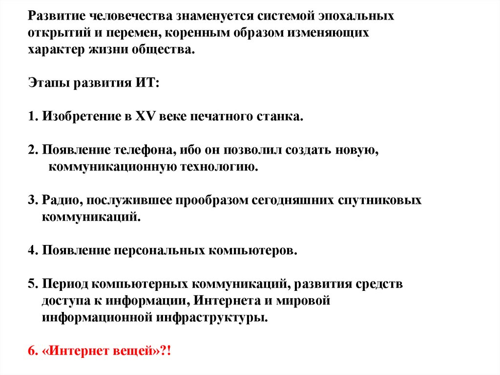 Развитие человечества знаменуется системой эпохальныхоткрытий и перемен, коренным образом изменяющих