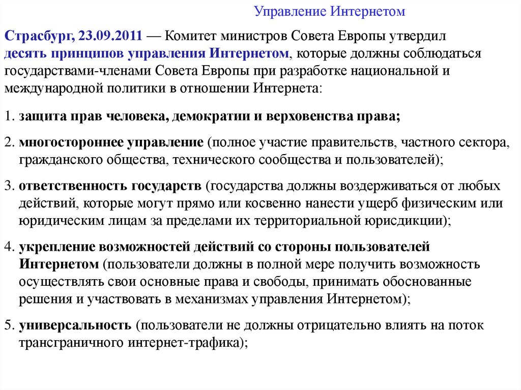 Управление ИнтернетомСтрасбург, 23.09.2011 — Комитет министров Совета Европы утвердил