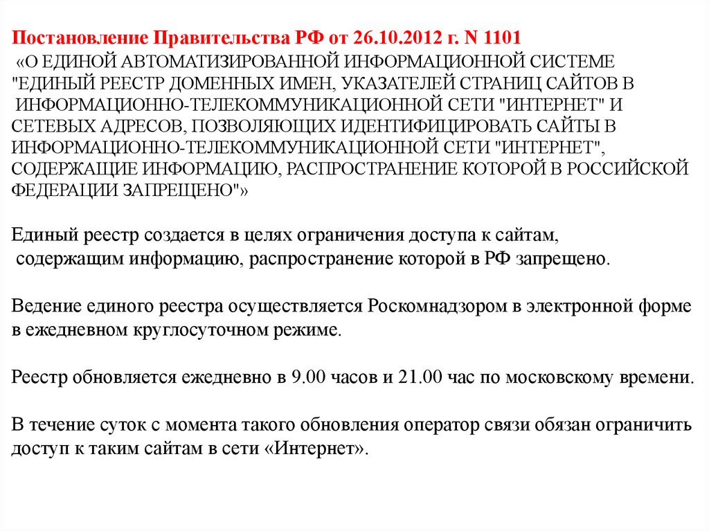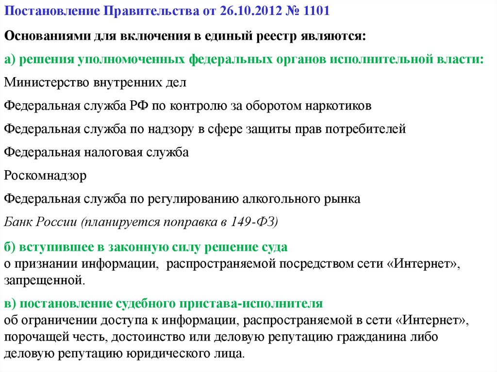 Постановление Правительства от 26.10.2012 № 1101Основаниями для включения в единый реестр являются: