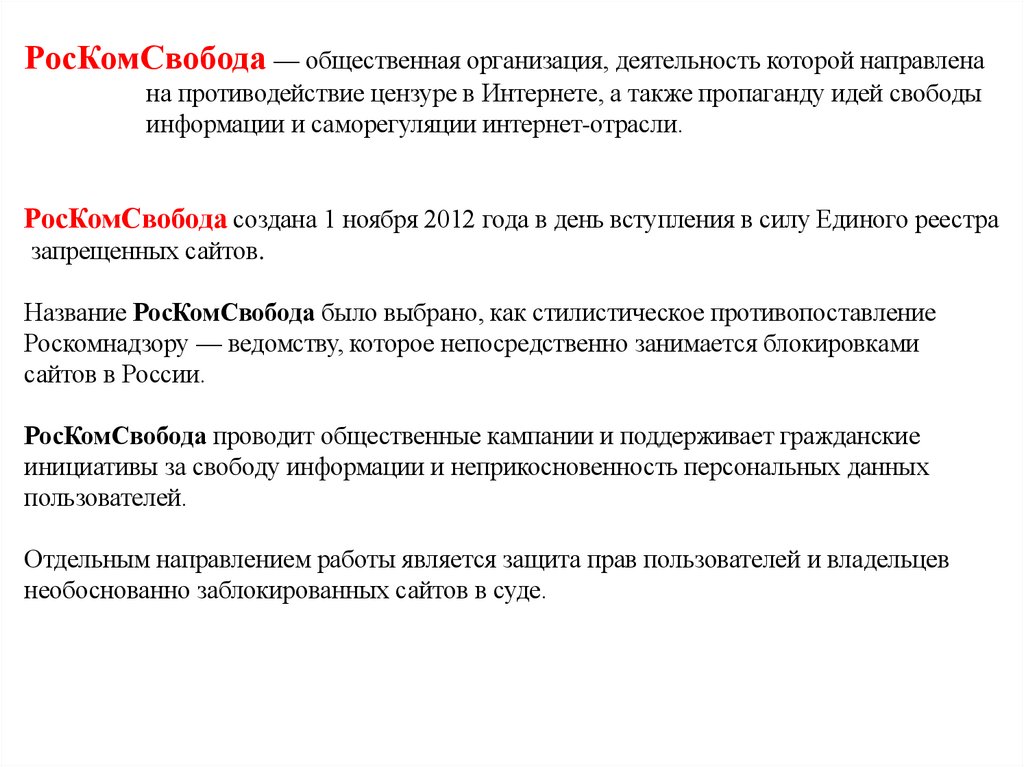 РосКомСвобода — общественная организация, деятельность которой направленана противодействие цензуре в Интернете, а также пропаганду идей свободы