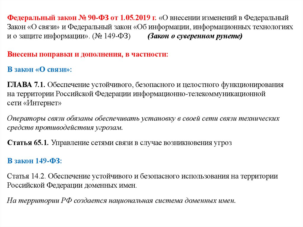 Федеральный закон № 90-ФЗ от 1.05.2019 г. «О внесении изменений в ФедеральныйЗакон «О связи» и Федеральный закон «Об информации, информационных технологиях