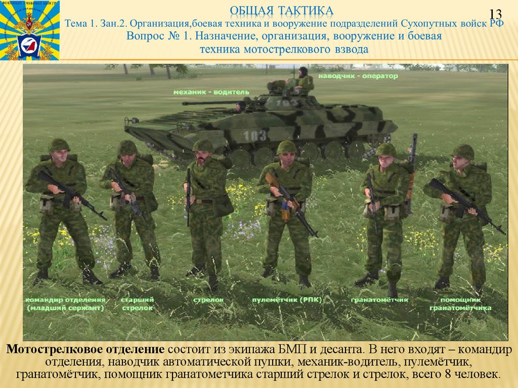 13Мотострелковое отделение состоит из экипажа БМП и десанта. В него входят – командир