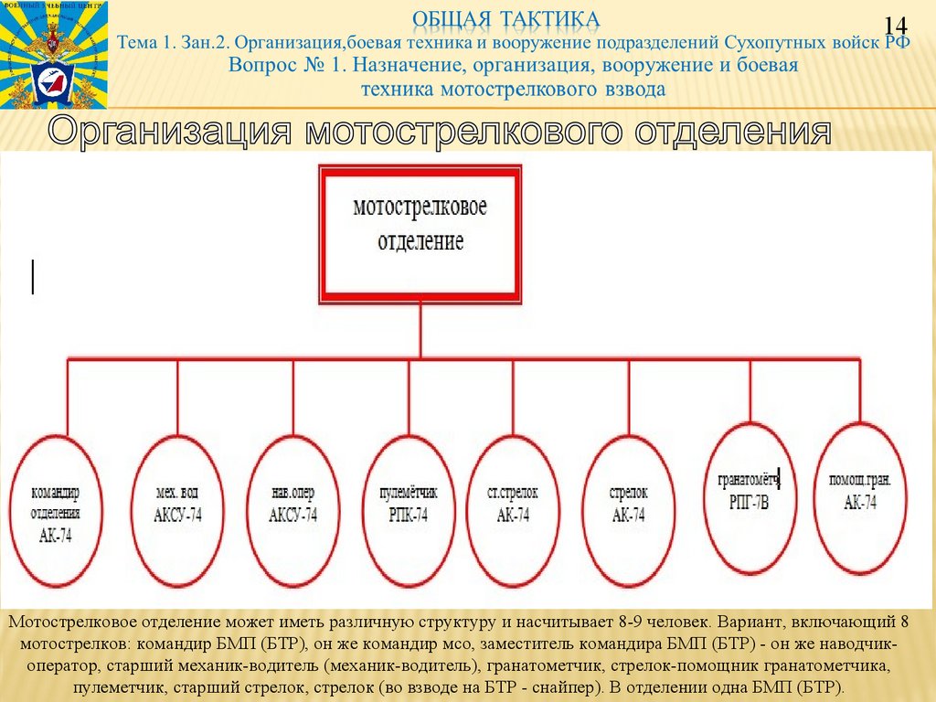 14Мотострелковое отделение может иметь различную структуру и насчитывает 8-9 человек. Вариант, включающий 8