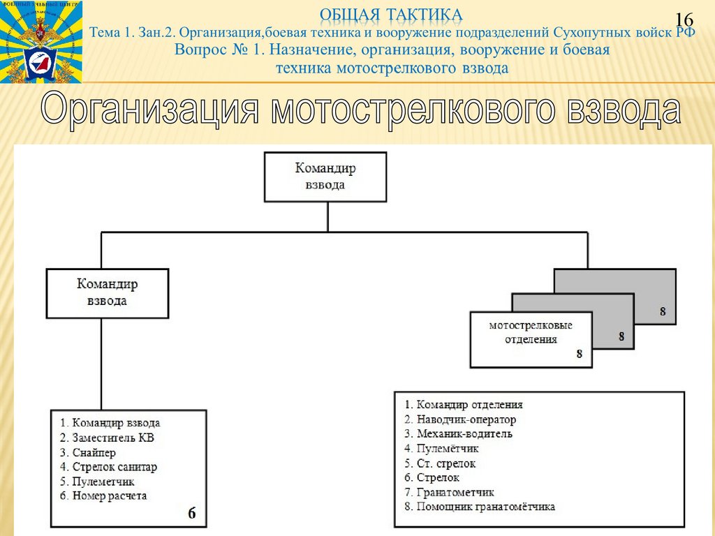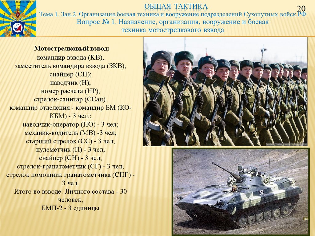 пулеметчик, номер расчета, стрелок-санитар. Всего во взводе 30 человек, 3 БМП.