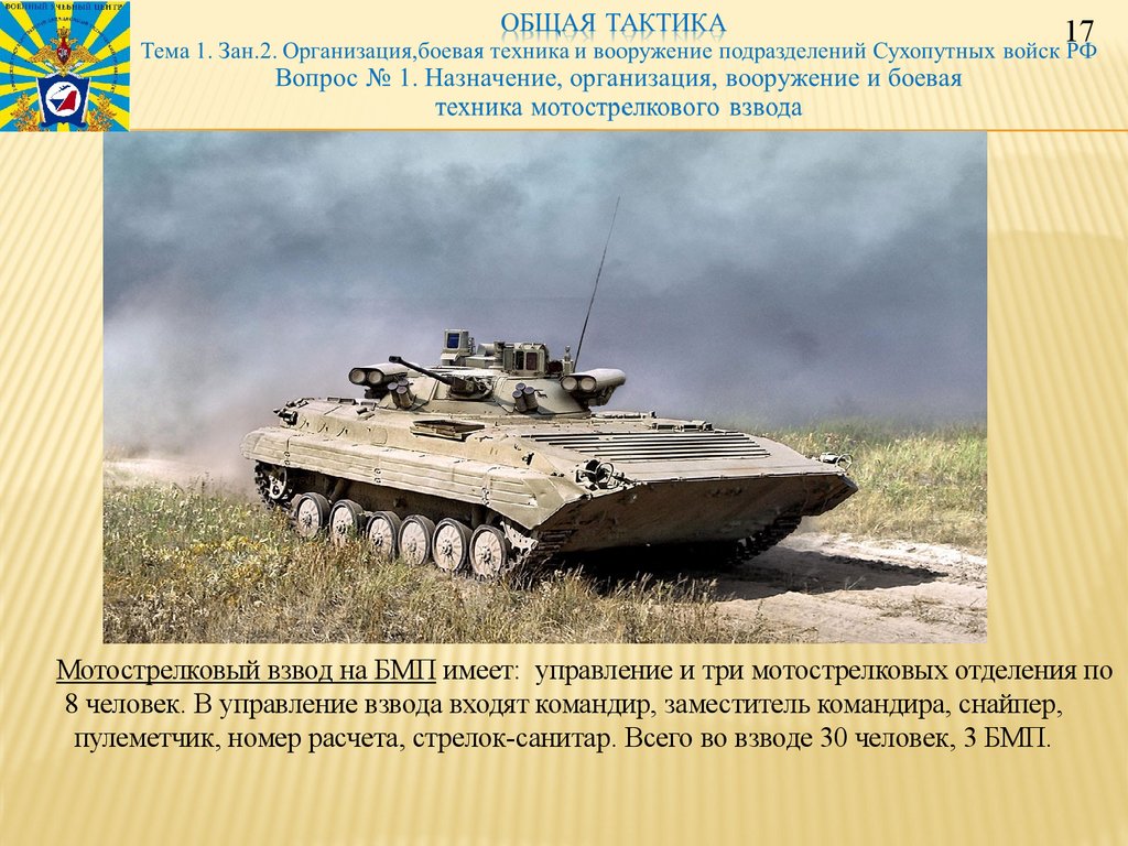 17Мотострелковый взвод на БМП имеет: управление и три мотострелковых отделения по