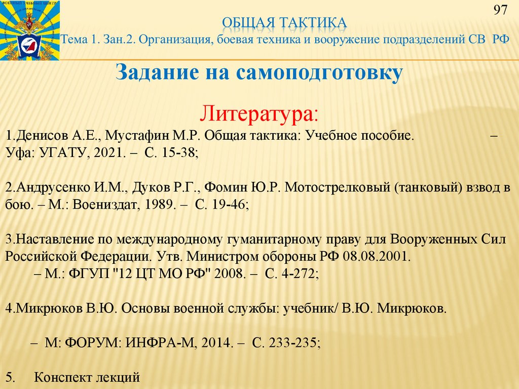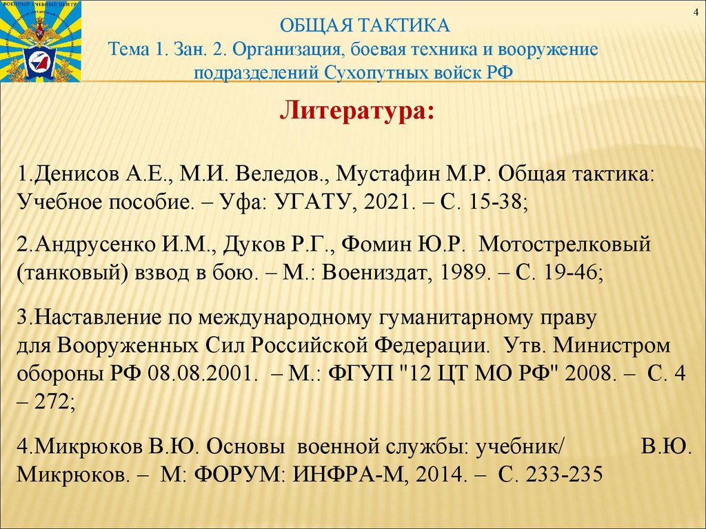 1.Денисов А.Е., Мустафин М.Р. Общая тактика: Учебное пособие.