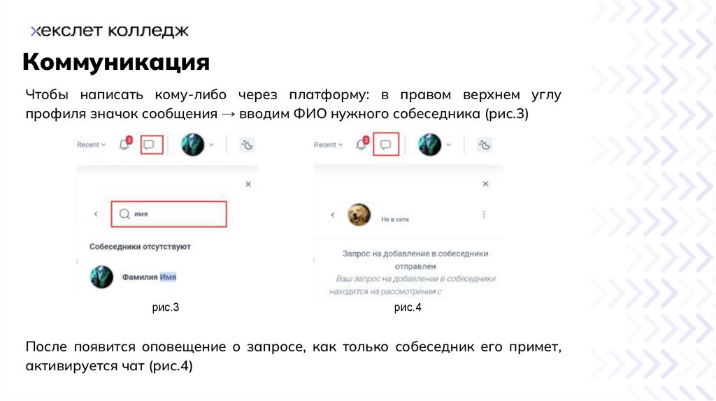 профиля значок сообщения → вводим ФИО нужного собеседника (рис.3)