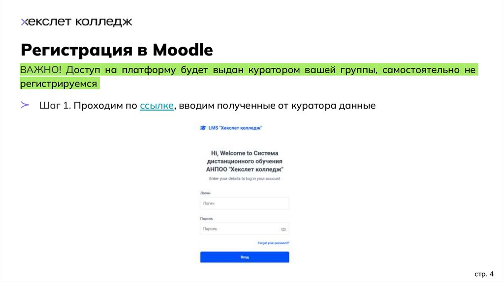 Регистрация в MoodleВАЖНО! Доступ на платформу будет выдан куратором вашей группы, самостоятельно не