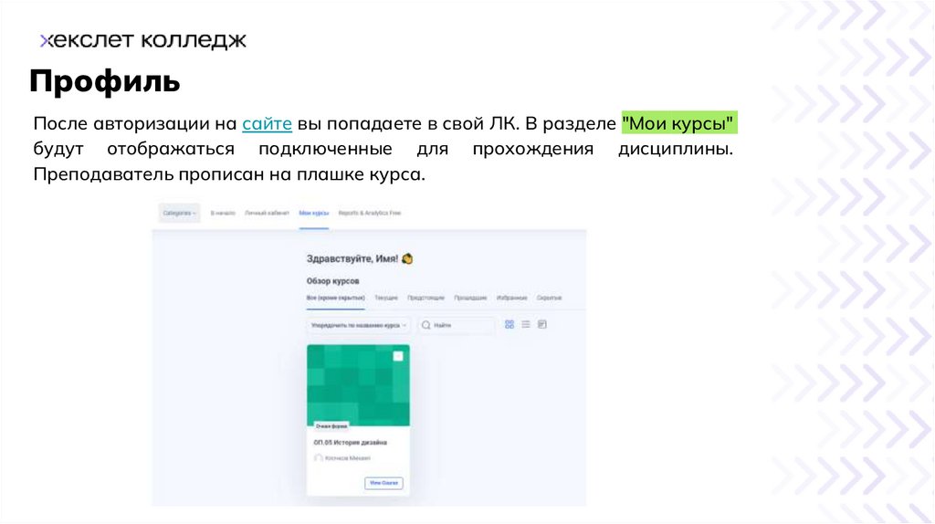 ПрофильПосле авторизации на сайте вы попадаете в свой ЛК. В разделе "Мои курсы"