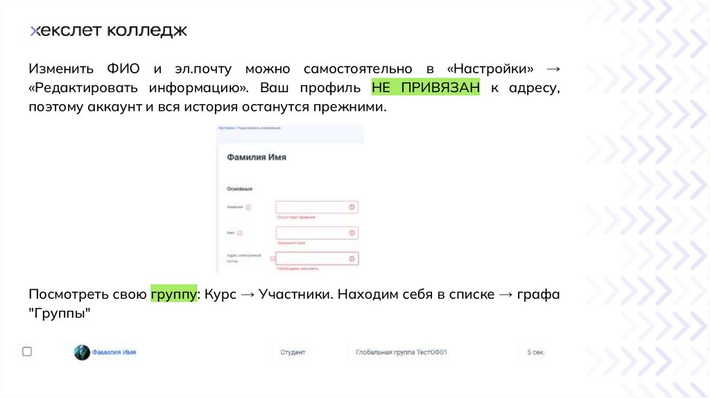 Изменить ФИО и эл.почту можно самостоятельно в «Настройки» →«Редактировать информацию». Ваш профиль НЕ ПРИВЯЗАН к адресу,