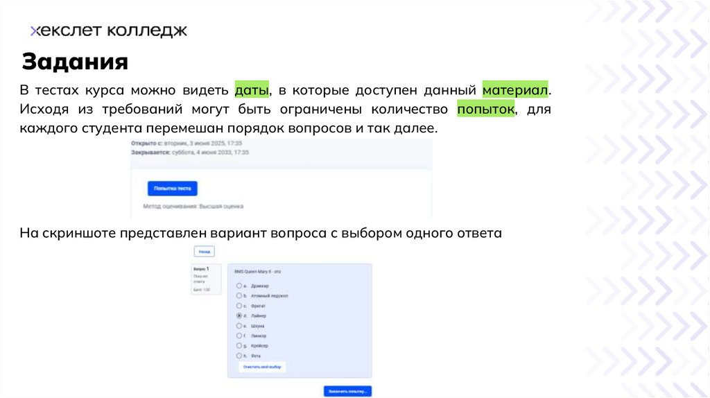 ЗаданияВ тестах курса можно видеть даты, в которые доступен данный материал.