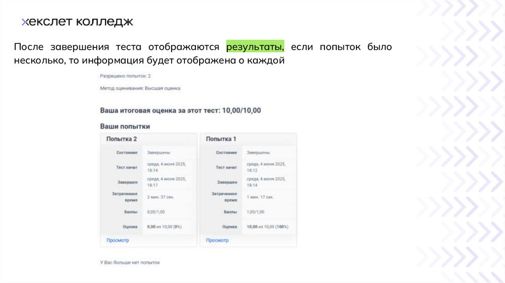 После завершения теста отображаются результаты, если попыток былонесколько, то информация будет отображена о каждой