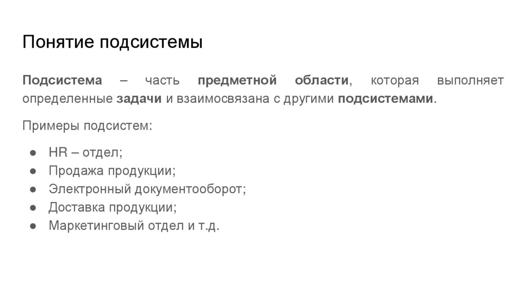 Понятие подсистемыПодсистема – часть предметной области, которая выполняет