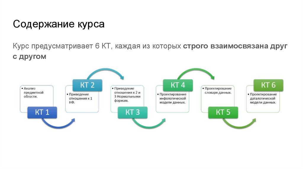 Содержание курсаКурс предусматривает 6 КТ, каждая из которых строго взаимосвязана друг
