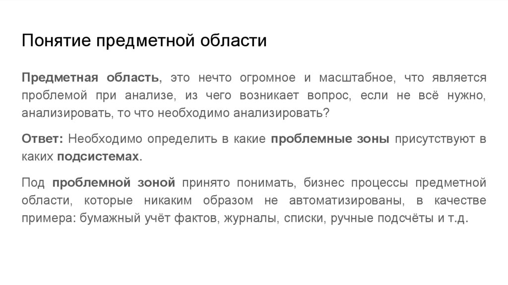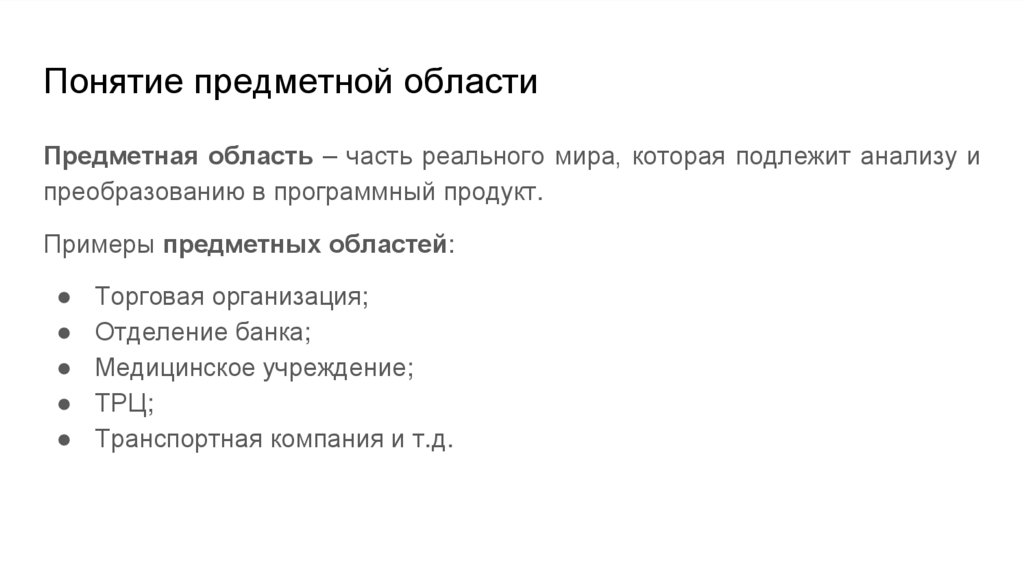 Понятие предметной областиПредметная область – часть реального мира, которая подлежит анализу и